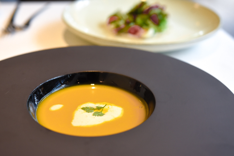 南瓜濃湯是意外驚喜,端上桌後服務員會拿著好大一罐胡椒到桌邊現磨,湯品細緻滑順、鹹甜適中讓人一口接一口。