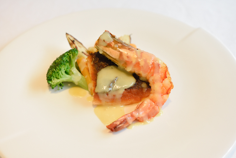另一道主餐選擇海鮮,鮭魚及大蝦都嚐得出新鮮且烹調得宜,特別是鮭魚鬆軟不油膩頗為可口。醬汁也是菜色亮點,甜酸濃郁相當適合搭配海鮮。