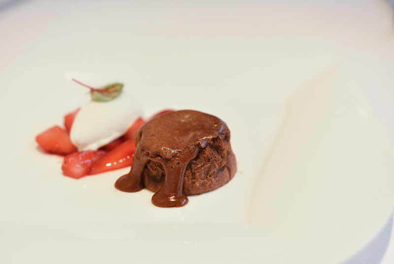 最後是甜點與飲品,飲品有咖啡與紅茶兩種,甜點是熔岩巧克力佐香草冰淇淋和莓果,巧克力醬香濃不甜,熱呼呼的就是好吃!